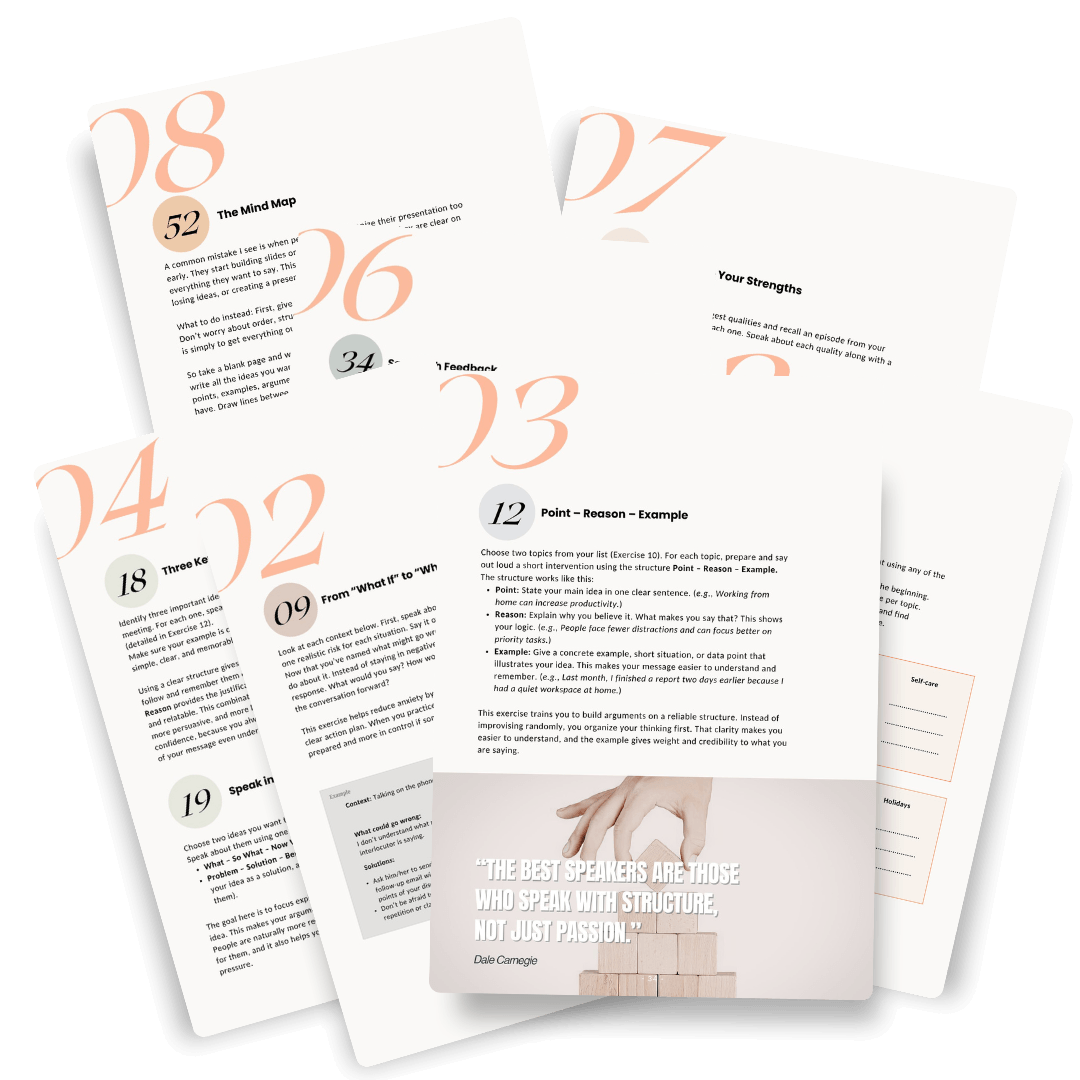 Acest ebook te ajută să vorbești cu mai multă încredere și autoritate în momentele alea care contează, fie că vorbim de un interviu, o negociere sau o prezentare.